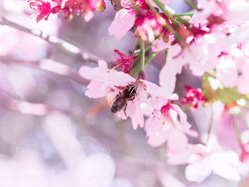 Насекомое пчела полетело на ветку цветущей вишни, собирая нектар. Солнечный день весной