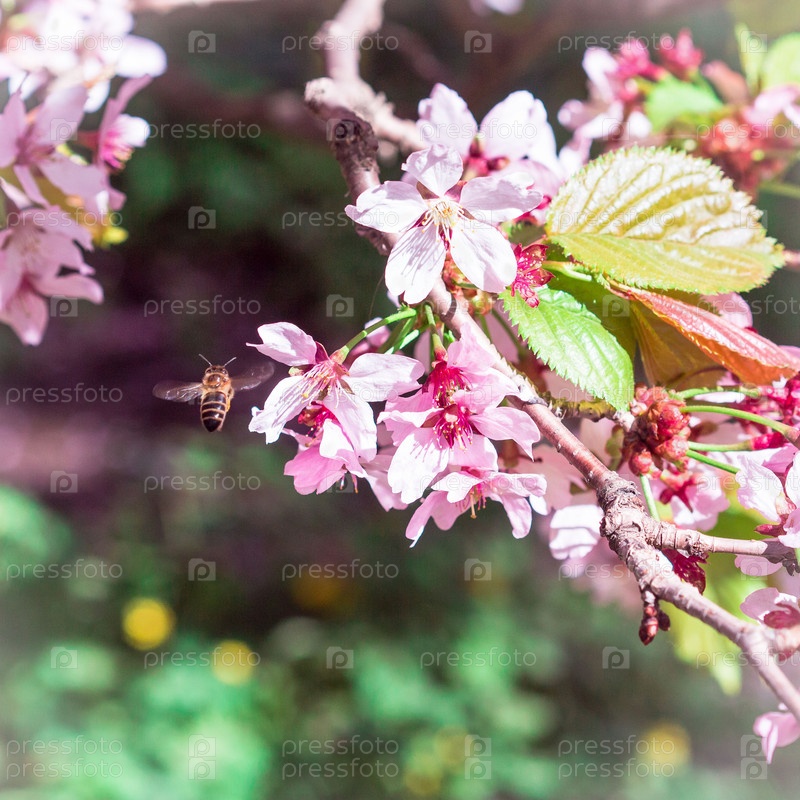 Насекомое пчела полетела на ветку цветущей вишни, собирая нектар. Солнечный день весной. Опыление
