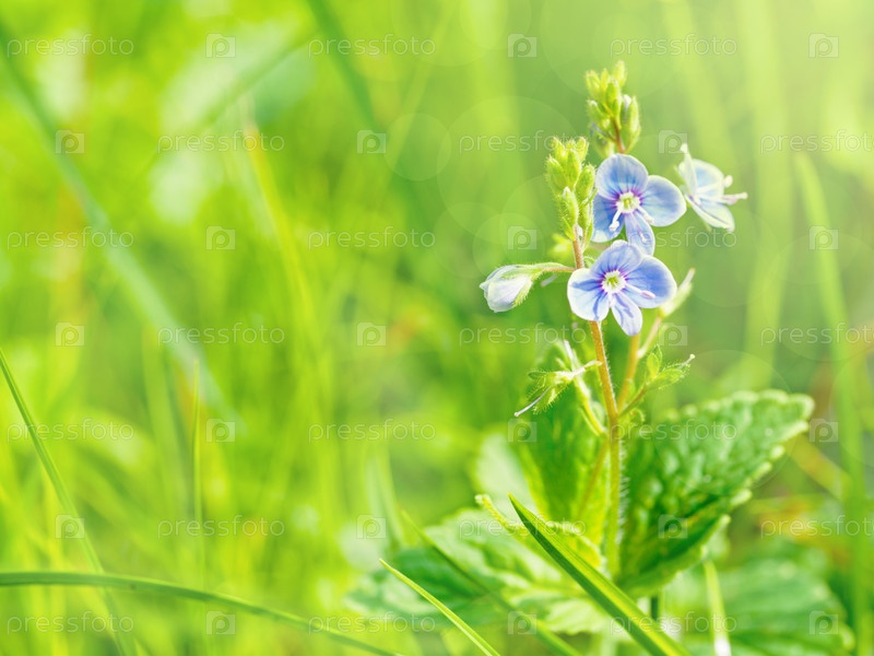 Маленькие синие цветы на ярко-зеленом поле в солнечный летний день. Легкое тонирование изображения, пустое место для текста