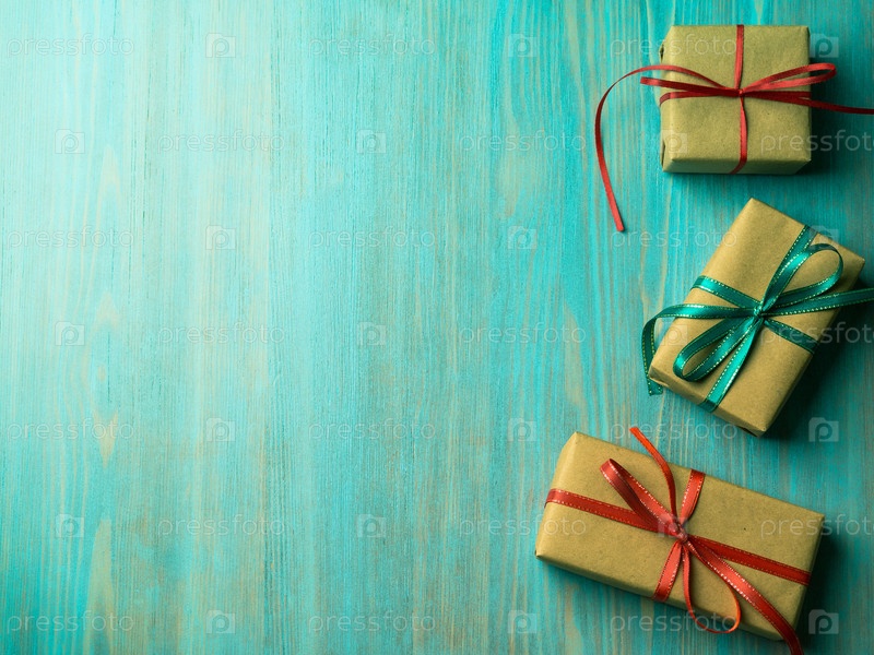 Подарочная упаковка, коробка с тенью с лентами красного и зеленого цвета на деревянном сине-зеленом столе