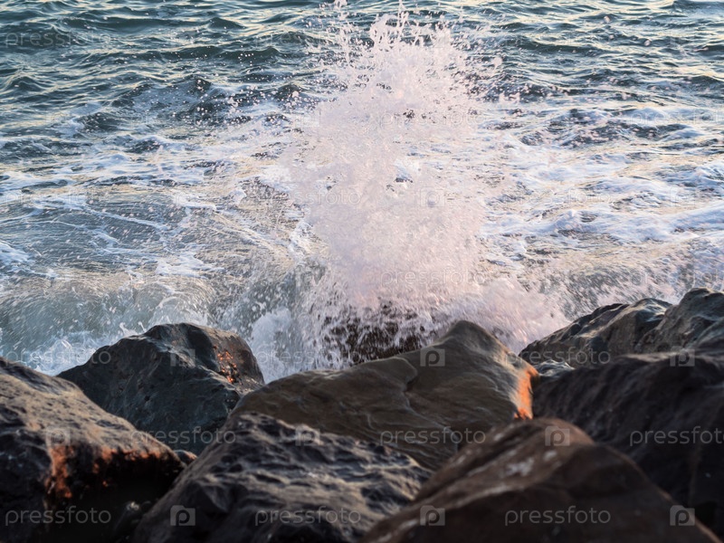 Волны бьются о камни на каменистом пляже, брызги воды, капли на розовом закате