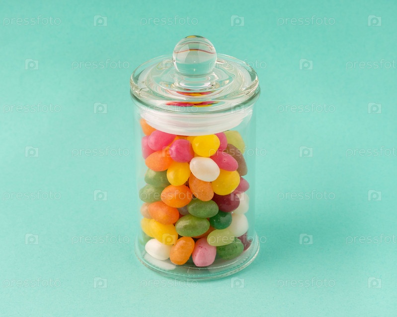 Стеклянная банка со сладостями, конфеты на бирюзовом фоне