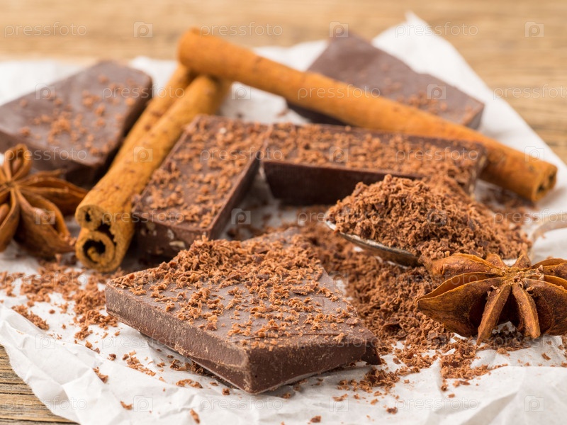 Поломанные кусочки шоколада, звездочки аниса, палочки корицы, крошка на пергаментной бумаге