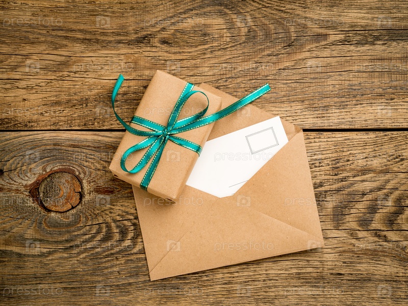 Праздничная подарочная коробка, перевязанная зеленой лентой, открытый конверт из крафт-бумаги с открыткой, письмо на деревянном выветренном деревенском фоне, вид сверху