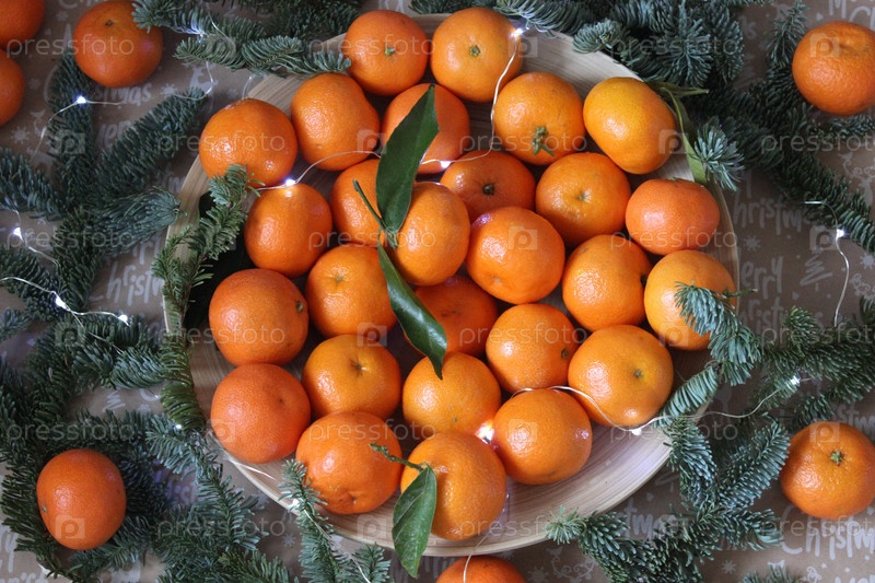 Мандарины на тарелке украшены еловыми ветками и рождественской гирляндой. Текстура или фон