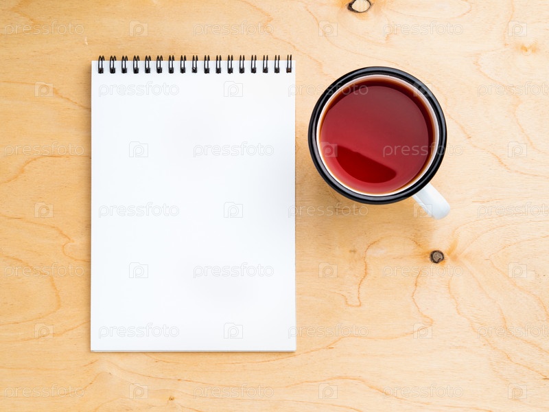 Металлическая кружка с чаем, пустой чистый лист блокнота на спирали на бежевом деревянном фоне