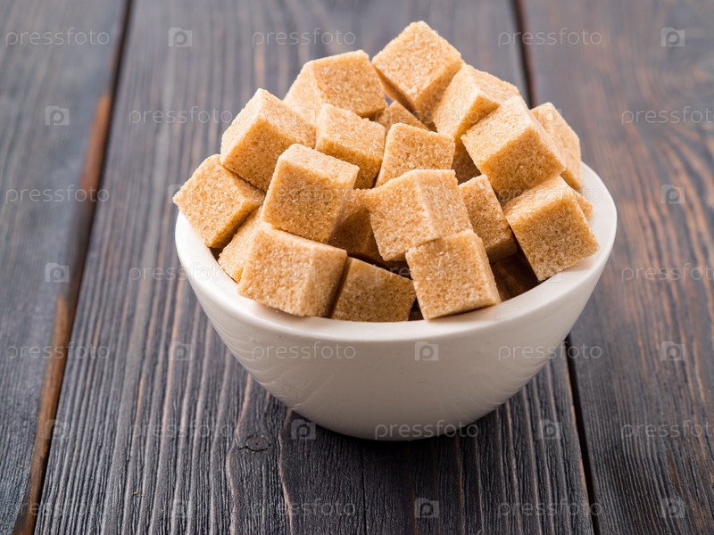 Коричневый тростниковый сахар в белой чашке на коричневом деревянном фоне, вид сбоку