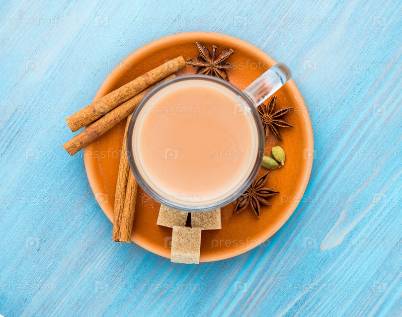 Масала индийский напиток на празднике Холи. Чай с молоком и специями в стеклянной кружке на синем деревянном столе, вид сверху