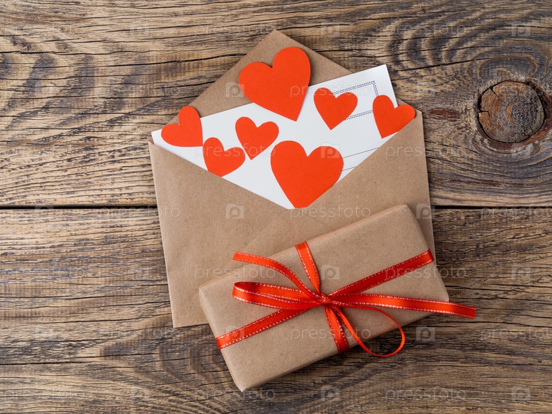 Открытка и красные сердца в открытом конверте из коричневой крафт-бумаги. Подарочная коробка с красной лентой на деревянном состаренном винтажном фоне. Поздравления с Днем святого Валентина