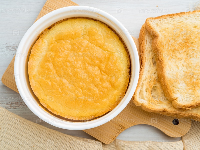 Белая круглая формочка с запеченным омлетом из яиц и молока, с корочкой, на белом деревянном столе, вид сверху