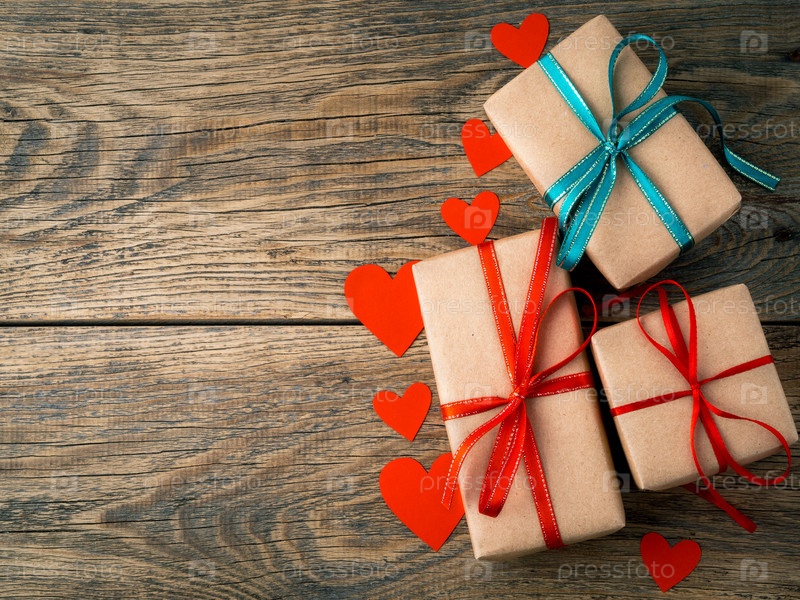 День святого Валентина фон. Подарки, завернутые в крафт-бумагу, с красными лентами, сердцами на состаренном деревенском старинном деревянном фоне