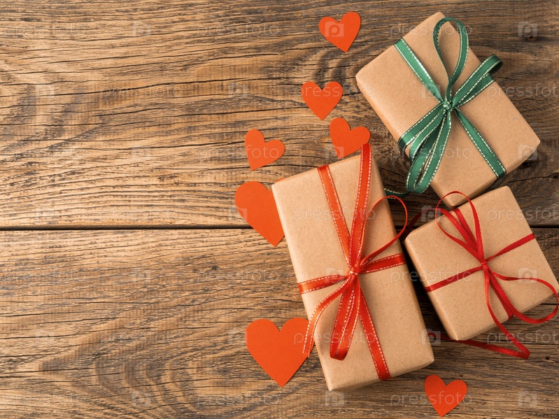 День святого Валентина фон. Подарки, завернутые в крафт-бумагу, с красными лентами, сердцами на состаренном деревенском старинном деревянном фоне