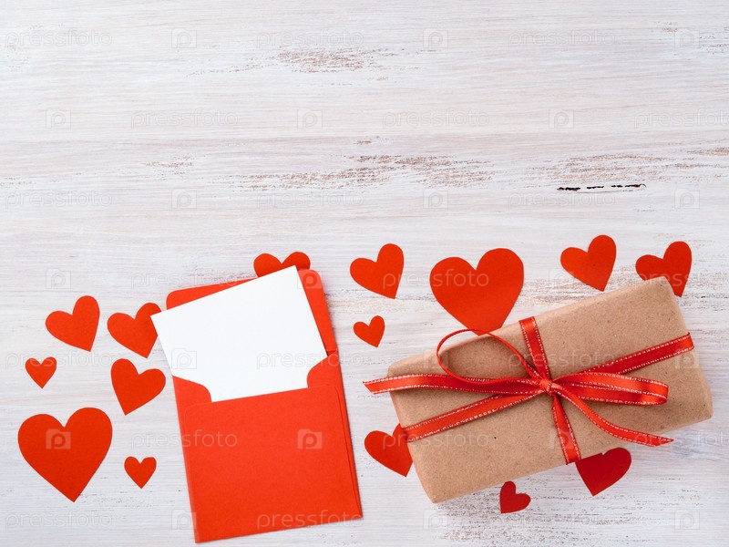 Символ дня святого валентина - подарочная коробка в крафтовой коричневой бумаге с красной лентой, конверт с чистым листом бумаги на белом фоне с множеством красных сердец, вид сбоку