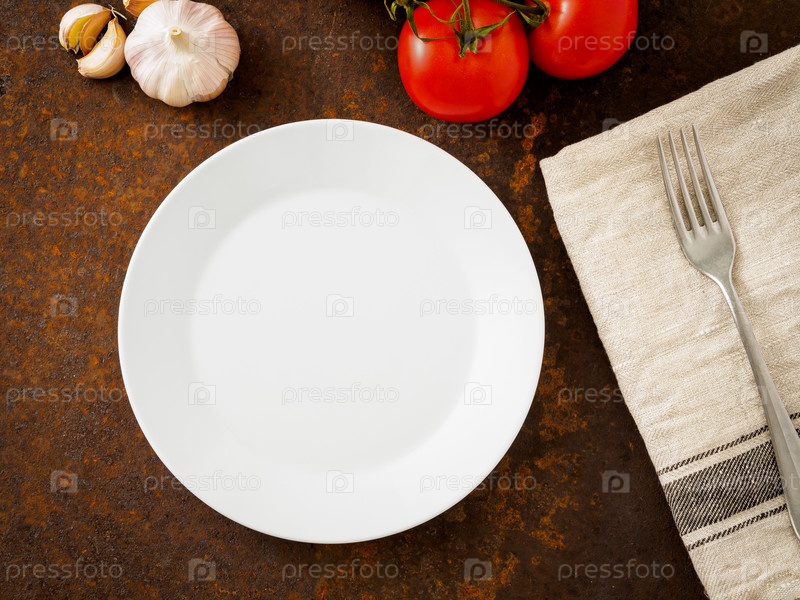 Чистая пустая белая тарелка и вилка на льняной салфетке на ржавом старом железном столе