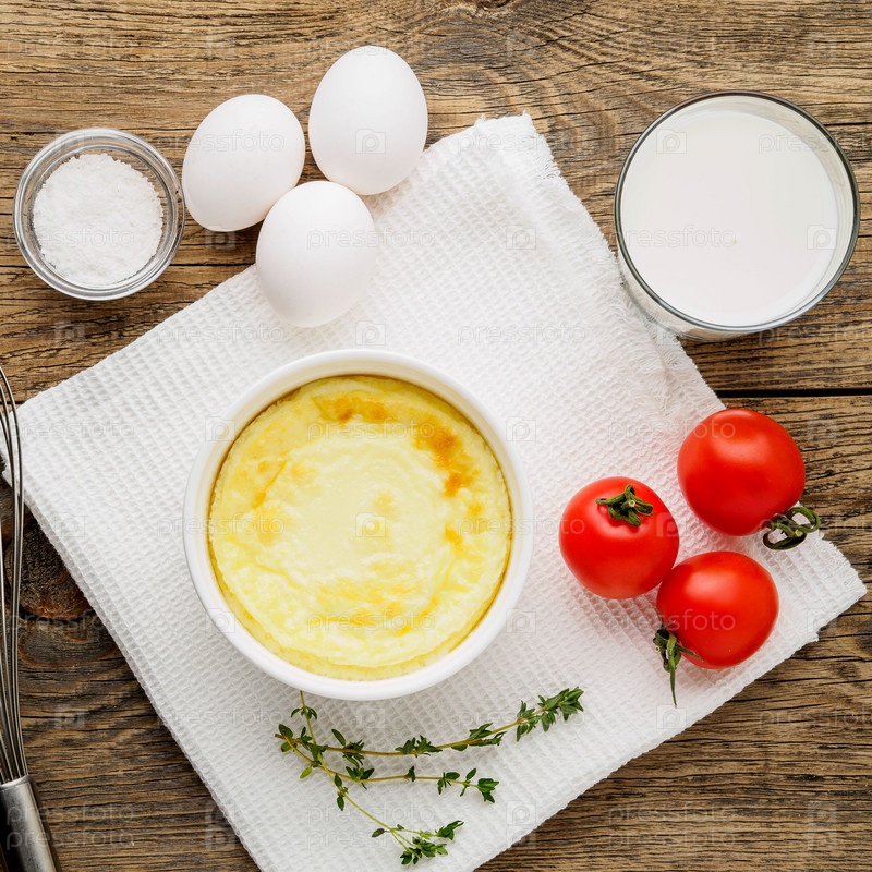 Белая круглая горшочка с запеченным омлетом из яиц и молока, с ингредиентами - помидорами, яйцами, солью, стаканом молока на коричневом деревенском деревянном столе, вид сверху