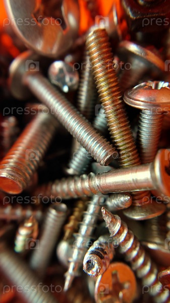 Хаотично лежащие болты, винты, гайки, вид сверху.Макрофотография.Текстура или фон.Выборочный фокус