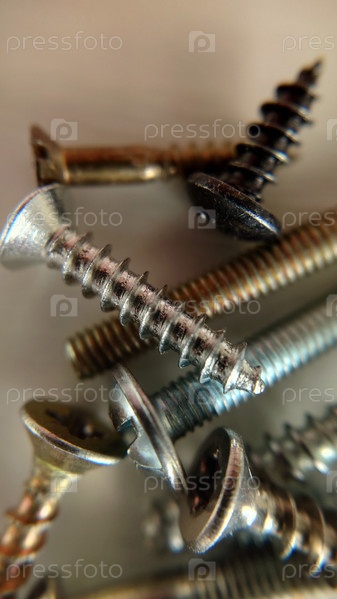 Фоновое изображение винтов болтов, лежащих на столе. Макрофотография.Текстура или фон.Выборочный фокус