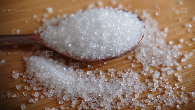Макрофотография. Ложка с сахаром на деревянном столе. Крупный план кристаллов сахара. Фон или текстура