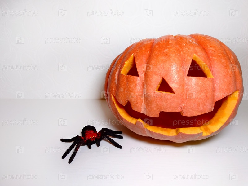 Забавная оранжевая тыква на Хэллоуин с черным пауком на светлом фоне