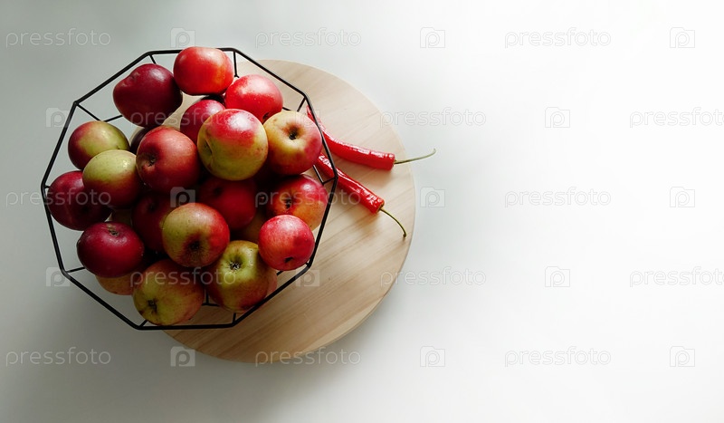 Фруктовая ваза с красными яблоками и двумя красными перцами чили на белом стеклянном столе в помещении. Вид сверху. Крупный план