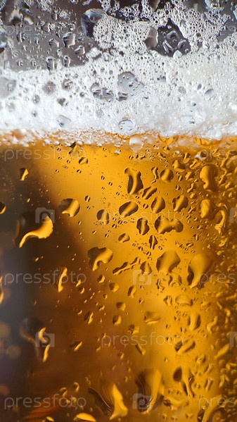 Макрокомпозиция золотого пива с пузырьками и пеной в стакане