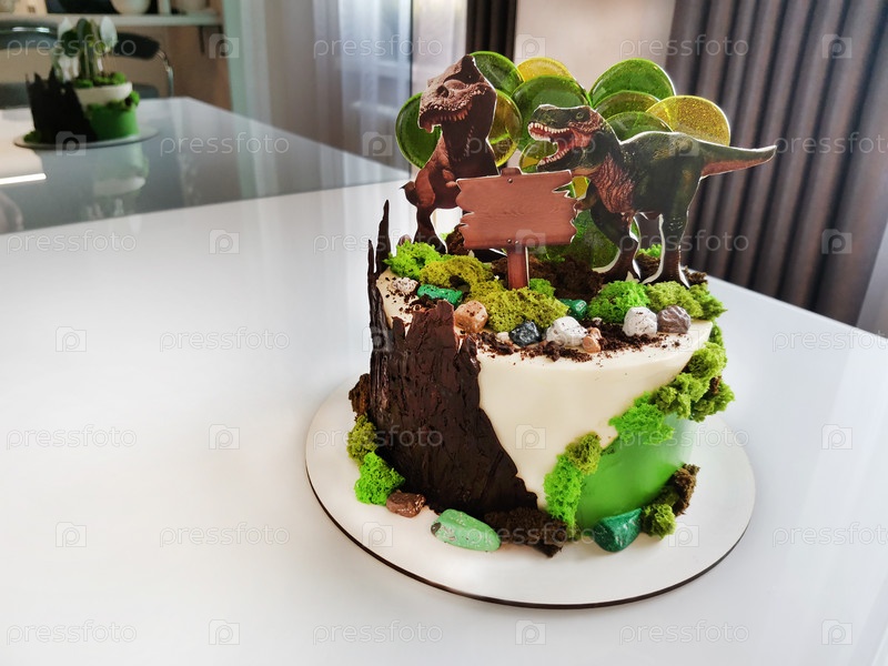 Торт на день рождения с двумя фигурками динозавров на поверхности