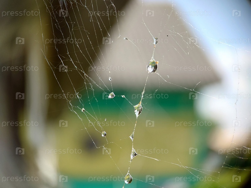 Паутинка с каплями дождя на поверхности на открытом воздухе.Макрофотография