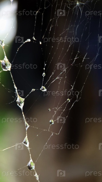 Капли росы крупным планом висят на паутине.Макрофотография.Избирательный фокус