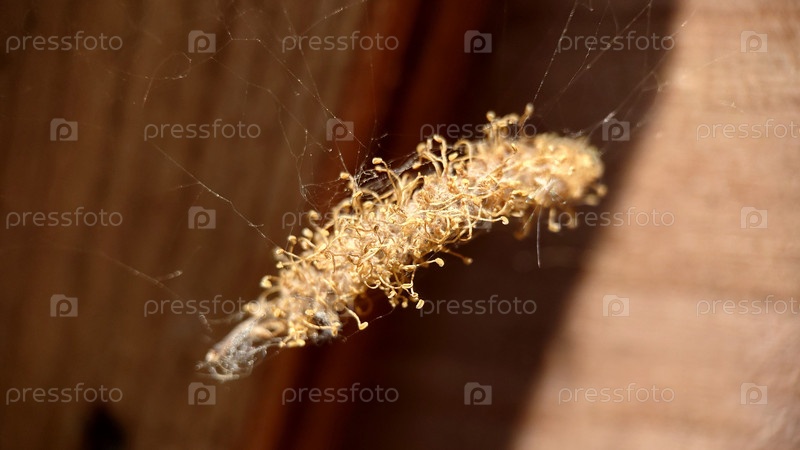 Макрофотография. Сухой золотой пучок весит на паутине крупным планом. Текстура или фон