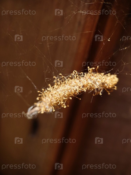 Макрофотография. Сухой золотистый сверток с личинкой весит на паутине. Текстура или фон
