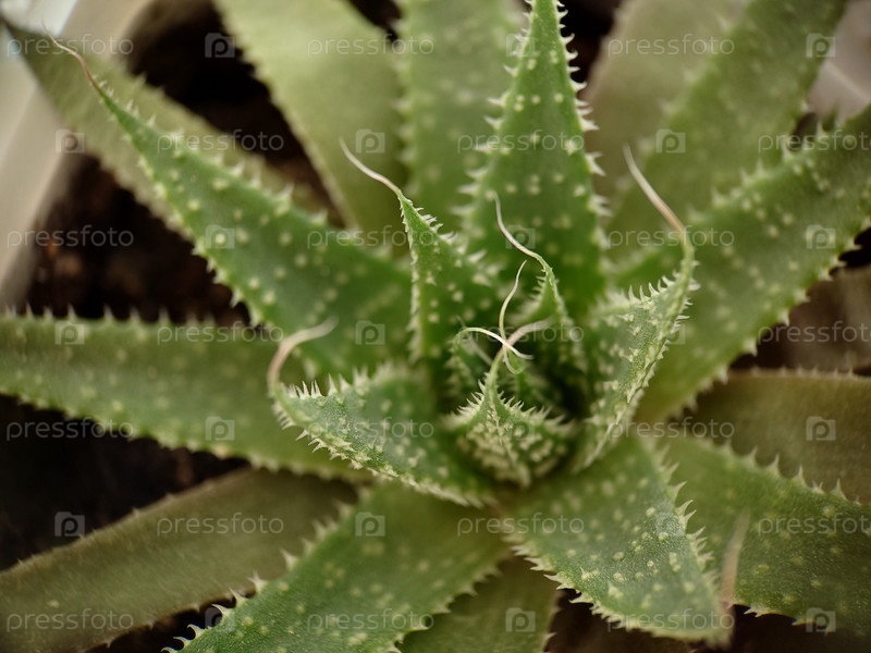 Макрофотография. Фоновое изображение зеленого растения алоэ в горшке. Текстура или фон. Избирательный фокус. Вид сверху