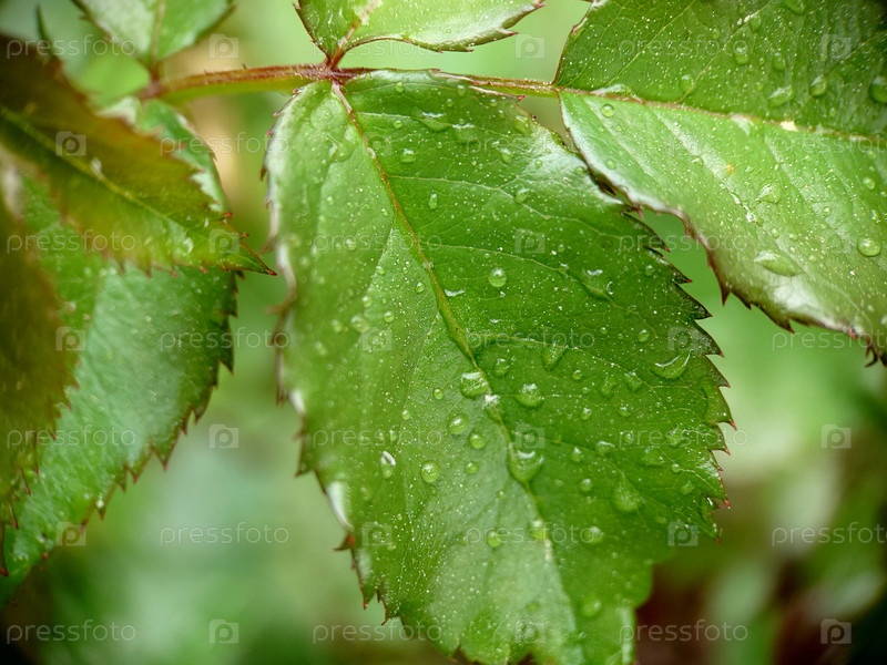 Маленькие капли дождя на зеленых листьях роз на открытом воздухе.Макрофотография.Текстура или фон
