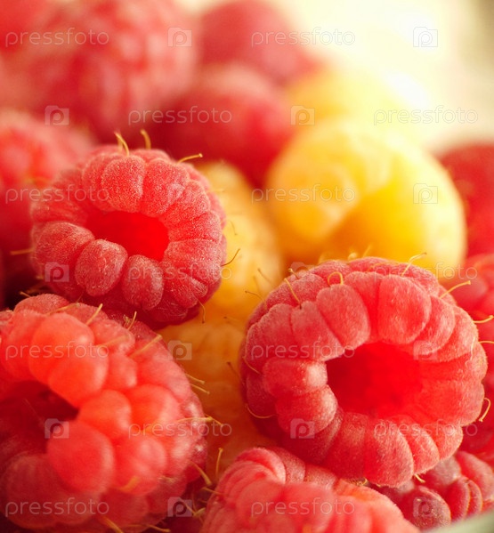 Красная и желтая садовая малина крупным планом, селективный фокус.Макросъемка.Текстура или фон.Селективный фокус
