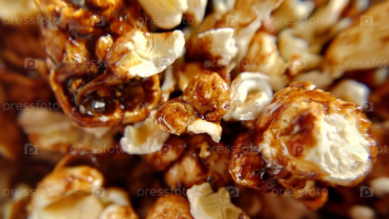 Избирательный фокус на горстке попкорна с карамелью крупным планом.Макросъемка.Текстура или фон.Избирательный фокус