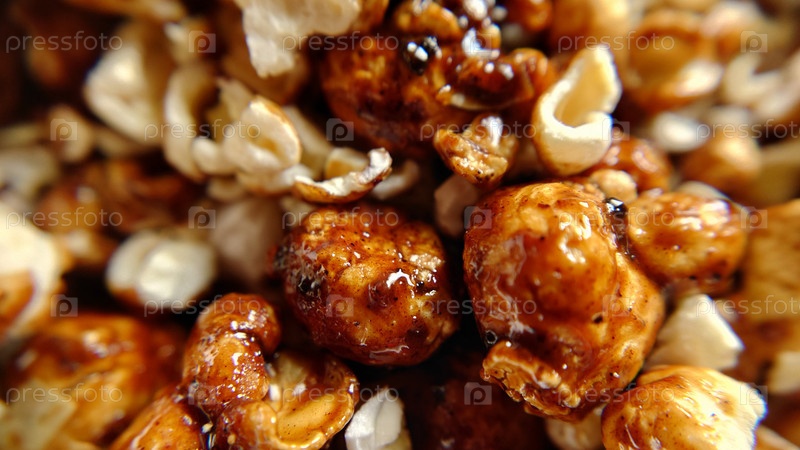 Макрофотография. Попкорн с карамелью крупным планом. Текстура или фон