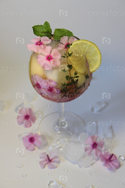 В стеклянном стакане охлажденный чай с веточкой мяты и цветами крупным планом
