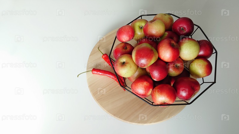 Фруктовая ваза с яблоками и перцем чили на белом стеклянном столе