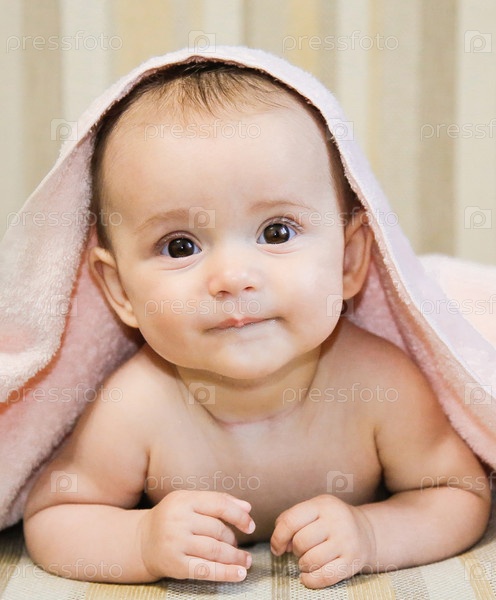 Милый малыш мирно лежит на мягкой поверхности, завернутый в уютное розовое полотенце, выглядя веселым и довольным