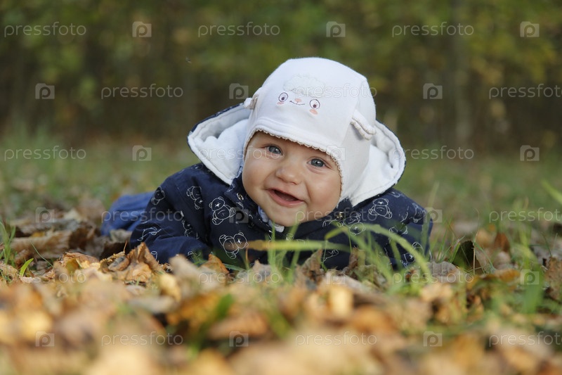 Малыш улыбается, лежа на осенних листьях