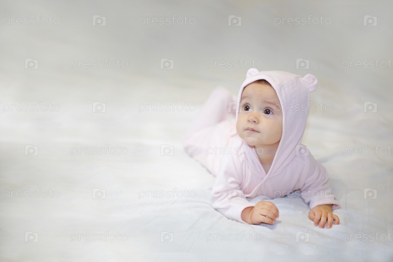 Очаровательный малыш, одетый в розовую толстовку с капюшоном и медвежьими ушками