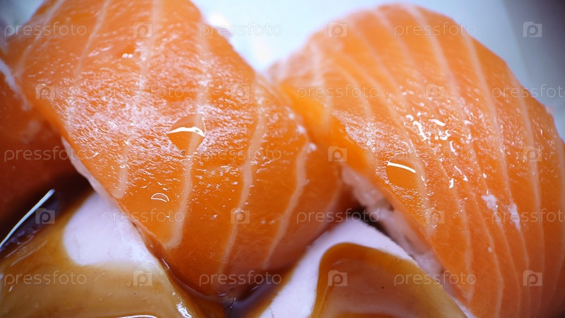 Текстура или фон.Традиционная азиатская кухня суши роллы из красной рыбы и ветчины крупным планом.Вид сверху.Макрофотография