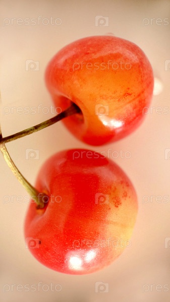 Спелые красно-желтые вишни выборочно выделяются на светлом фоне.Макросъемка.Текстура или фон.Выборочный фокус