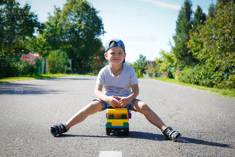 Мальчик играет на дороге с большим игрушечным грузовиком