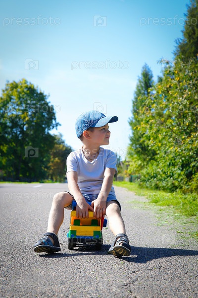 Маленький мальчик едет на своем ярком и красочном игрушечном грузовике по дороге под ясным голубым небом