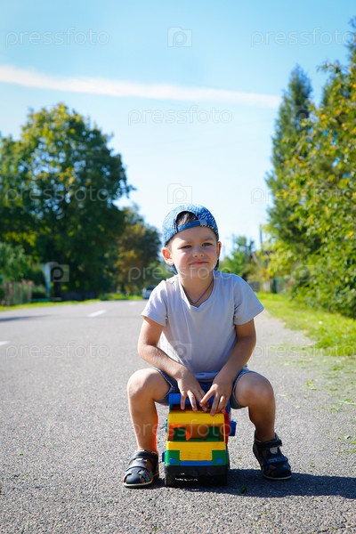 Маленький мальчик едет на своем ярком и красочном игрушечном грузовике по дороге под ясным голубым небом в сельской местности