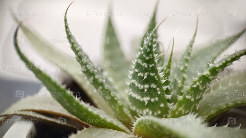 Макрофотография. Комнатное зеленое растение алоэ крупным планом в горшке. Текстура или фон. Избирательный фокус