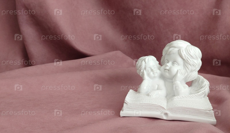 Гипсовая статуэтка двух белых ангелов, читающих большую книгу. Текстура или фон