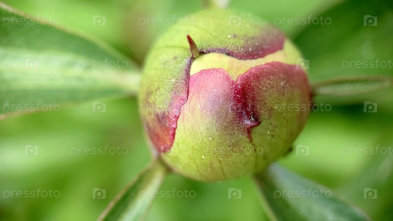 Крупный план нераскрывшегося бутона пиона на фоне травы. Макрофотография. Текстура или фон