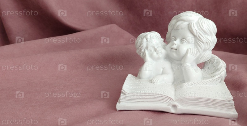 Гипсовая статуэтка маленьких лежащих ангелов, читающих большую книгу. Детали и портрет. Место для текста. Фон или текстура