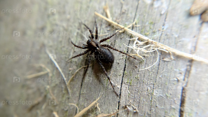 Черный паук на фоне старой деревянной доски.Макросъемка.Выборочный фокус.Текстура или фон